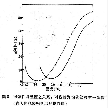 圖3表明硫化膠之彈性體彈性隨溫度降低而下降,如前所述,這種變化一直到達(dá)彈性最低點(diǎn)或者二級(jí)轉(zhuǎn)化溫度而成為鋼彈性。在此溫度時(shí),硫化膠彈性體彈性消失;在這個(gè)溫度以上,硫化膠是柔靭的。因此低溫屈撓性能與彈性的關(guān)系十分密切。硫化膠與硫化膠之間的二級(jí)轉(zhuǎn)化溫度猶如彈性一樣,的確各不相同。在室溫下初始彈性比較高的硫化膠直到非常低的溫度才凍結(jié),因而其低溫屈撓性也比較好。由于硫化程度相當(dāng)高的硫化膠通常有比較高的彈性,所以低溫屈撓性能也是比較好的。
