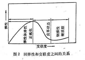 誠(chéng)然,方程式2只在一定的交聯(lián)范圍內(nèi)適用。如果硫化膠嚴(yán)重過(guò)硫(為保證使硫化膠具有高彈性而壓縮變形又比較低,往往有意稍加過(guò)硫,見(jiàn)1.1.3.4節(jié)),彈性體彈性就降低。若交聯(lián)度繼續(xù)增加,就變成所謂鋼彈性(在硬質(zhì)膠范圍內(nèi))(見(jiàn)圖2)。