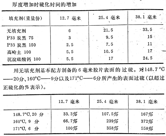 例如,6毫米厚無填充劑膠片的正硫化是148.7°C--20分、160℃—9分、171°℃—6分鐘,當(dāng)厚度增加至12.7毫米、25.4毫米及38.1毫米時,硫化時間分別需要延長6分、21.5分和33.5分鐘。由于硫化時間增加,超過正硫化而產(chǎn)生表面過硫的情況就因硫化溫度而異。當(dāng)在148.7℃—20分鐘的情況下增加6分鐘時(127毫米厚的試片),過硫度為33.3%,160℃—9分鐘的硫化增加同樣時間,過硫度增至66.7%。而試片在171℃—6分鐘正硫化后又增加6分鐘則過硫度為100%。