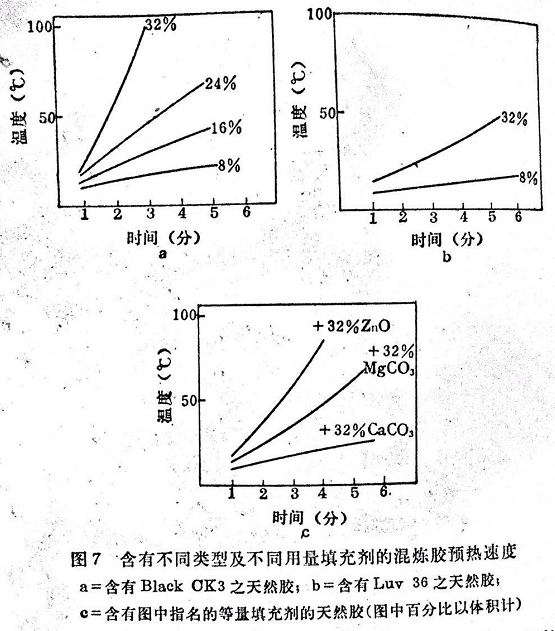 圖7的曲線(xiàn)表示填充劑類(lèi)型及其用量對(duì)膠料加熱速度的影響。譬如可以看到,炭黑用量增加時(shí),加熱速度加快Black CK3的這種傾向比Luv36大。如含有32%(以體積計(jì))的 Black CK3的混煉膠兩分鐘即可加熱至80℃左右,而含同樣比例的LuV36膠料,在同樣時(shí)間內(nèi)僅達(dá)32℃。在淺色填料中,氧化鋅要比碳酸鎂加熱快,而碳酸鎂又比碳酸鈣快。