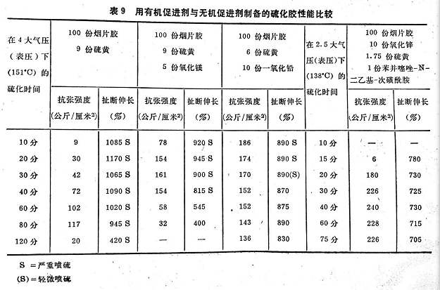 在橡膠硫化中使用有機(jī)促進(jìn)劑是50年前的事情,這對切橡膠產(chǎn)品的制造是一個(gè)革命性的變化,也是繼發(fā)現(xiàn)硫化作用后橡膠工業(yè)中最重要的進(jìn)步之一。首先發(fā)現(xiàn)使用有機(jī)促進(jìn)劑能夠大大縮短硫化時(shí)間。其次發(fā)現(xiàn)有機(jī)促進(jìn)劑對不同生膠還不止于有均衡不同硫化特性的作用。后來又發(fā)現(xiàn)一些更為重要的優(yōu)點(diǎn)而使有機(jī)促進(jìn)劑成為橡膠工業(yè)必不可少的原料,并有助于橡膠制品質(zhì)量的不斷提高。較短的硫化時(shí)間和較低的硫化溫度使橡膠經(jīng)受的條件溫和得多,這就是有機(jī)促進(jìn)劑的優(yōu)點(diǎn)所在。此外,使用有機(jī)促進(jìn)劑還能降低得到最優(yōu)物理性能時(shí)的硫黃用量,因而可以改善橡膠制品的耐老化性能并能防止噴硫。減少硫黃用量的重要成效是能得到平坦的硫化曲線(硫化平坦效應(yīng)),這意味著相應(yīng)于最優(yōu)性能的硫化時(shí)間較長,過硫的危險(xiǎn)性較小,使大型制品能均勻硫化(見表9)。