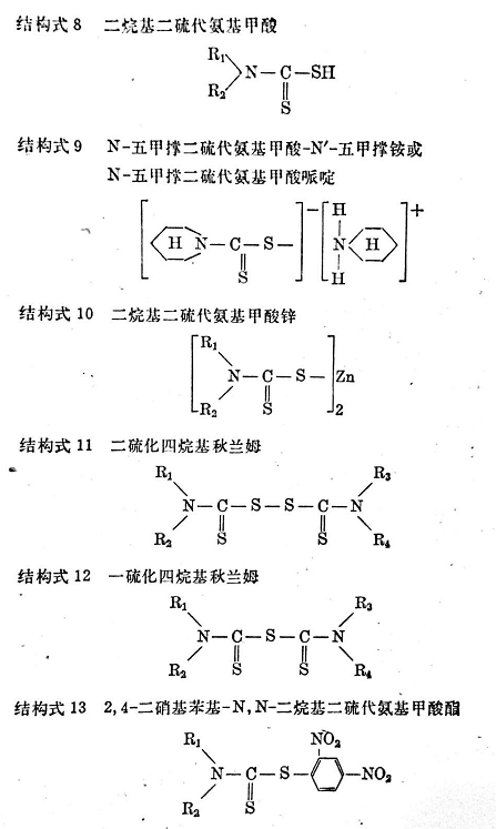 此后,以這些發(fā)現(xiàn)為基礎(chǔ),對(duì)有機(jī)促進(jìn)劑所作的進(jìn)一步研究就是力圖使一些硫化過(guò)快的膠料變?yōu)橥搜恿蚧鸩降哪z料,希望得到比二硫代氨基甲酸鹽和硫醇基芳撐噻唑操作安全性更好、膠料流動(dòng)時(shí)間較長(zhǎng)的促進(jìn)劑。經(jīng)研究發(fā)現(xiàn),改變對(duì)硫化行為有實(shí)際作用的官能團(tuán)便有可能實(shí)現(xiàn)這種設(shè)想。例如,在二烷基、烷基環(huán)烷基、烷基芳基二硫代氨基甲酸(二烷基二硫代氨基甲酸的結(jié)構(gòu),見(jiàn)結(jié)構(gòu)式8)的硫醇硫上和硫醇基芳撐噻唑中的硫醇硫上可以進(jìn)行取代。