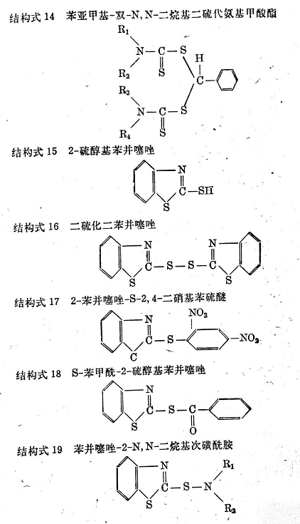 至1932年,又發(fā)現(xiàn)一類新的促進(jìn)劑:硫醇基芳撐噻唑特別是2-硫醇基苯并噻唑的次磺酰胺化合物(見(jiàn)結(jié)構(gòu)式19),這是當(dāng)時(shí)德國(guó)IG公司的利瓦爾庫(kù)森工廠推薦的。這是一些退延硫化起步性能特別優(yōu)良的促進(jìn)劑,還可以說(shuō)是目前應(yīng)用最廣的一類促進(jìn)劑。這些促進(jìn)劑可以通過(guò)N-氯胺與硫醇基噻唑鈉鹽26~268的作用制備,也可以通過(guò)硫醇基噻唑與脂肪族或雜環(huán)伯胺或仲胺的共氧化制備。還有用2-硫醇基苯并噻唑與二乙胺、脈啶、嗎啡啉、2,6-二甲基嗎啡啉、環(huán)己胺、二環(huán)己胺、二異丙胺、丁胺和叔辛胺制備的次磺酰胺促進(jìn)劑也必須提到。