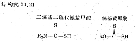 用二硫代羧酸官能團(結構式20和21)可以解釋二硫代氨基甲酸鹽和黃原酸鹽的功能。