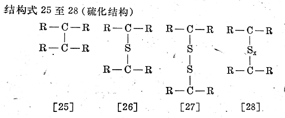 根據(jù)不同的硫化體系,產(chǎn)生同樣交聯(lián)密度或得到同樣定伸強(qiáng)度時所需要的硫黃用量是不一樣的,可見進(jìn)入交聯(lián)鍵中硫分子的大小亦不相同。交聯(lián)所需的硫越少,分子內(nèi)結(jié)合的硫(環(huán)化硫)也越少。當(dāng)促進(jìn)劑用量比較高而硫黃用量比較低的時候,除形成一定數(shù)量的單硫鍵(見結(jié)構(gòu)式26)外,可以設(shè)想還會形成雙硫鍵(見結(jié)構(gòu)式27),因為存在的少量惰性硫在反應(yīng)中被大量促進(jìn)劑所分解,而其中一部分分解為硫原子。在硫黃用量比較高的許多硫化體系中,除形成一定量的多硫鍵外,主要生成雙硫鍵(結(jié)構(gòu)式27),在硫黃使用不太合理的體系中(如含堿性促進(jìn)劑的體系)必然形成多硫鍵(即Sx橋鍵,見結(jié)構(gòu)式28)。如果體系中沒有硫,就不會有硫鍵產(chǎn)生,而形成純C一C鍵(見結(jié)構(gòu)式25)。