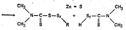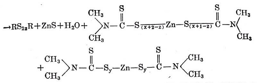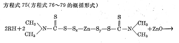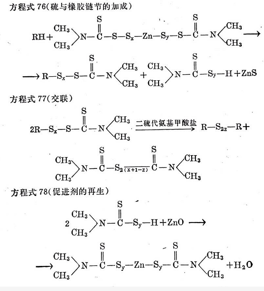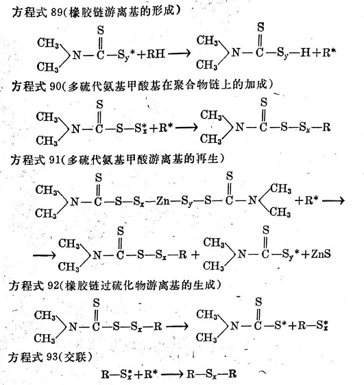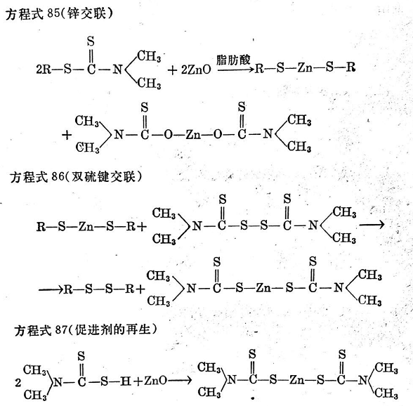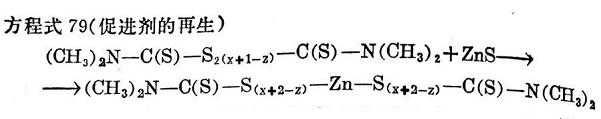 這一交聯(lián)過程(見方程式76~79)需要氧化鋅,以便使多硫代氨基甲酸轉(zhuǎn)化為多硫代氨基甲酸鹽(方程式78和79),多硫代氨基甲酸是方程式75中形成的中間產(chǎn)物。