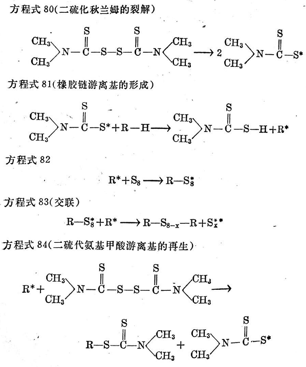 根據(jù)許多作者的看法,在二硫化四甲基秋蘭姆硫化中38-832可能有游離基交聯(lián)機(jī)理(見方程式80~87)。