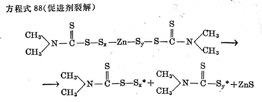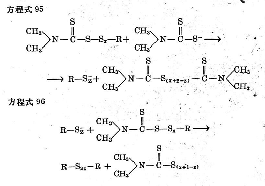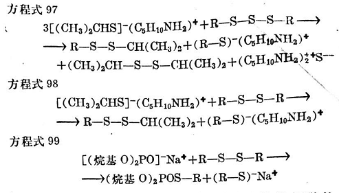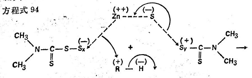 這一反應(yīng)裂解出硫化鋅,烴基則鍵合到過硫化物陰離子上,氫就與類似的過硫化物陽離子結(jié)合在一起。上述作者認(rèn)為,以后的交聯(lián)反應(yīng)應(yīng)該按下列方式進(jìn)行(見方程式95和96)。
