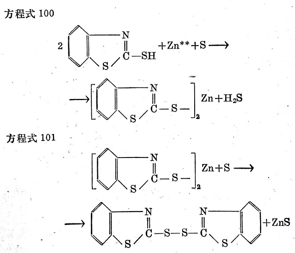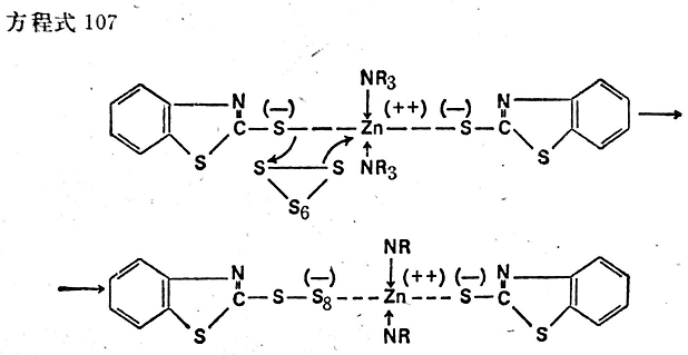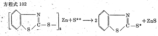 J.奧爾巴克(J. Auerbach)也假定,含有2-硫醇基苯并噻唑和氧化鋅的膠料生成硫醇鋅,是硫化中開始反應(yīng)的初期階段。但不認(rèn)為硫醇鋅本身是一種活化物質(zhì)。反之,他假定鋅通過一個(gè)不是十分明確的機(jī)理裂解出來,而2-硫醇基苯并噻唑基立即作為游離基或離子進(jìn)行反應(yīng)(見方程式102)。
