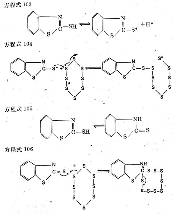 M.戈登假定2-硫醇基苯并噻唑以下列方式被硫黃活化,這里的反應(yīng)或者是游離基型反應(yīng),或者是離子型反應(yīng)(見方程式103~106)。