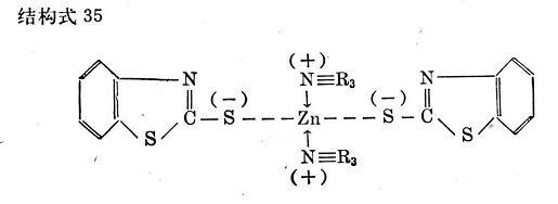 根據(jù)最近的理論34,用氧化鋅時(shí),可以由2-硫醇基苯并噻唑形成絡(luò)合物,其活性比純促進(jìn)劑高(見結(jié)構(gòu)式33和34)。在產(chǎn)生這些絡(luò)合物的初期仍然形成硫醇鋅,其他作者假定這是最初的反應(yīng)。