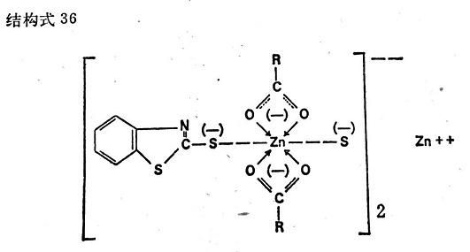 通過堿或脂肪酸的作用,氮和氧的配合基可以按結(jié)構(gòu)式35和36的形式連接到促進(jìn)劑絡(luò)合物的鋅原子上。