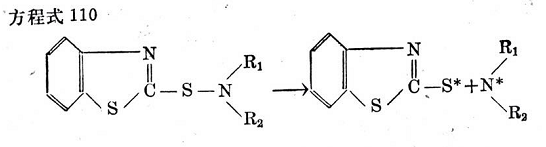 膠料用硫黃和次磺酰胺促進(jìn)劑硫化時(shí),硫黃和真正的活化促進(jìn)劑(它是由次磺酰胺在硫化起步前的誘導(dǎo)期內(nèi)形成的)與中間產(chǎn)物之間有一個(gè)平衡狀態(tài)。據(jù)信在誘導(dǎo)期內(nèi)能夠從次磺酰胺自動(dòng)催化生成相應(yīng)的硫醇銨,它是一種真正的促進(jìn)劑,誘導(dǎo)期的長短取決于次磺酰胺的化學(xué)結(jié)構(gòu),胺的空間位阻越大,則退延硫化起步的作用也越大。這一點(diǎn)也為W.謝勒所證實(shí),他發(fā)現(xiàn),當(dāng)用硫醇銨時(shí),硫黃量逐漸降低的情況與用次磺酰胺進(jìn)行相應(yīng)的試驗(yàn)完全一樣。次磺酰胺在極性溶劑中分解生成硫醇銨7的事實(shí)也足以說明真正的反應(yīng)產(chǎn)物是硫醇和胺。在硫黃存在時(shí),次磺酰胺熱分解首先形成2硫醇基苯并噻唑游離基和相應(yīng)于次磺酰胺的胺游離基。兩者都能活化并參與硫化(見方程式110)。