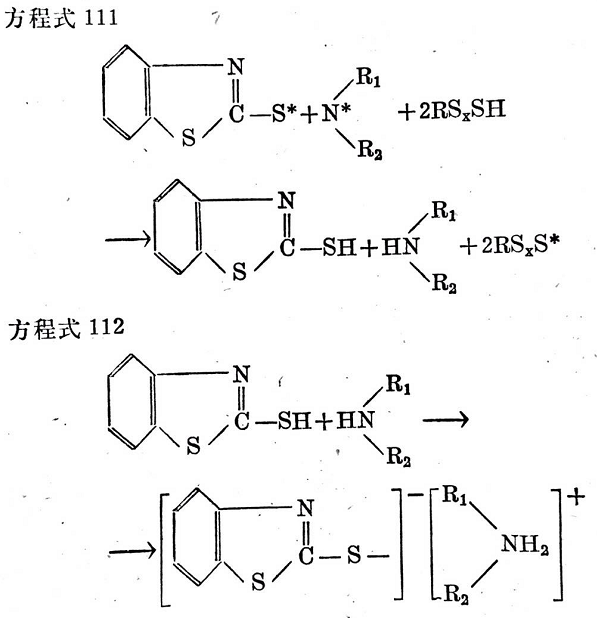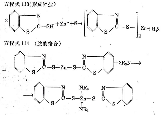 根據(jù)H.克雷布斯關(guān)于二硫代氨基甲酸鋅的堿性活化作用的假說,如方程式56和方程式107所示,可以想像,這里也形成一種促進(jìn)劑、鋅、硫和胺的絡(luò)合物。這種絡(luò)合物通過與橡膠烴鏈的脫氫反應(yīng),可能形成一種真正的多硫化硫醇鹽,不過至今尚未確證這種物質(zhì)的存在。作為真正的活化物質(zhì)的絡(luò)合物可能是按下列反應(yīng)形成的(方程式113至116)。