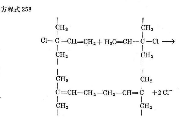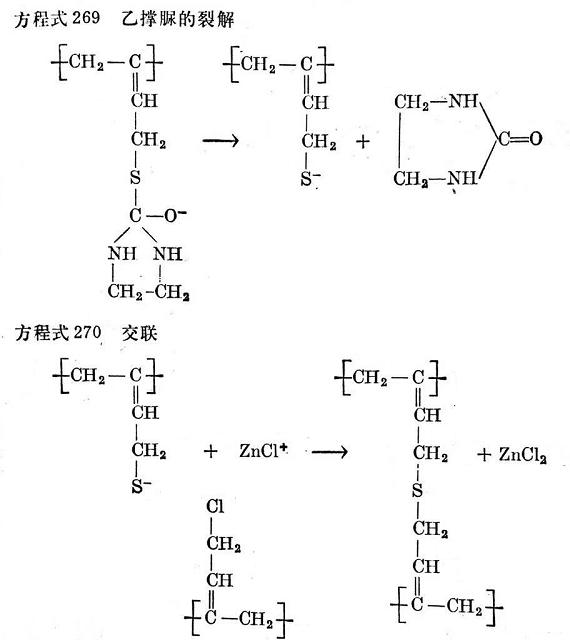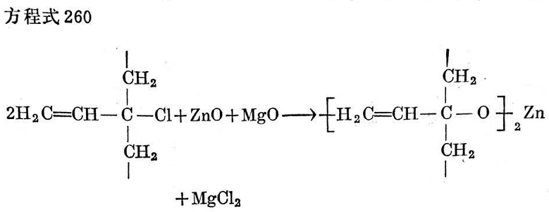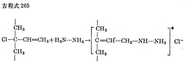 剛才提到的熱處理,能使聚氯丁二烯失去烯丙基位置上的不穩(wěn)定氯原子。用這種方法處理過的氯丁膠(這樣就不含活潑氯)便不再靠氧化鋅取得滿意的硫化。但是,它仍能用象1,4-二氯丁烯-2這樣一類物質(zhì)進行交聯(lián),這些物質(zhì)顯然不是在氯分裂后形成游離位置上攻擊高聚物分子。同樣,用二元堿如二胺處理的聚氯丁二烯,也不能用氧化鋅交聯(lián)。這種處理也在烯丙烯基位置上分裂出氯原子,如方程式265所示。