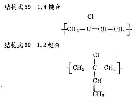 氯的氧化裂解生成氯化氫。氯丁膠明顯的交聯(lián)傾向可以歸因于2-氯丁二烯-1,3單體有極高的反應性(也就是聚合速度),它比異戊二烯的反應性約大700倍795,796。據(jù)推測交聯(lián)是由烯丙基位置上所鍵合的活性氯引發(fā)的938在2-氯丁二烯-1,3的聚合過程中,除通常發(fā)生的1,4鍵合外,約有15克分子%的單體按1,2位置鍵合,其結(jié)果如結(jié)構式59和60所示,氯結(jié)合到烯丙基的叔碳原子上,現(xiàn)已知道這種氯是特別活潑的。