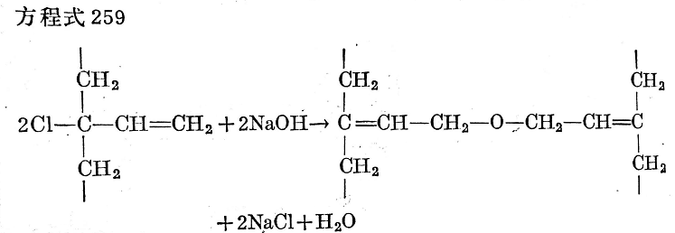 這個氯原子很容易分裂并產(chǎn)生交聯(lián)反應。氯丁膠制造的方法決定了氯原子分裂的容易程度。活性氯的一部分對氯丁膠交聯(lián)起作用,它的裂解情況最容易從膠乳中觀察到,因為膠乳的水相能使烯丙基位置上的部分氯以水解的形式分裂出來。水解所形成的氯化氫能夠通過將堿金屬松香亭酸鹽(乳化劑)轉(zhuǎn)化為游離酸而破壞膠乳的貯備堿,這導致產(chǎn)生絮凝而最后沉淀。隨著活性氯的水解,由于形成醚鍵而實現(xiàn)部分交聯(lián)(見方程式259):