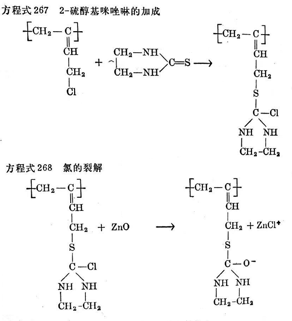 根據(jù)R.帕里塞爾(R. Pariser)的意見,用硫脲衍生物,例如硫醇基咪唑啉時,交聯(lián)反應的特性是烯丙基鍵合的氯原子參與反應,在這一反應期間,氯原子為促進劑基所取代。