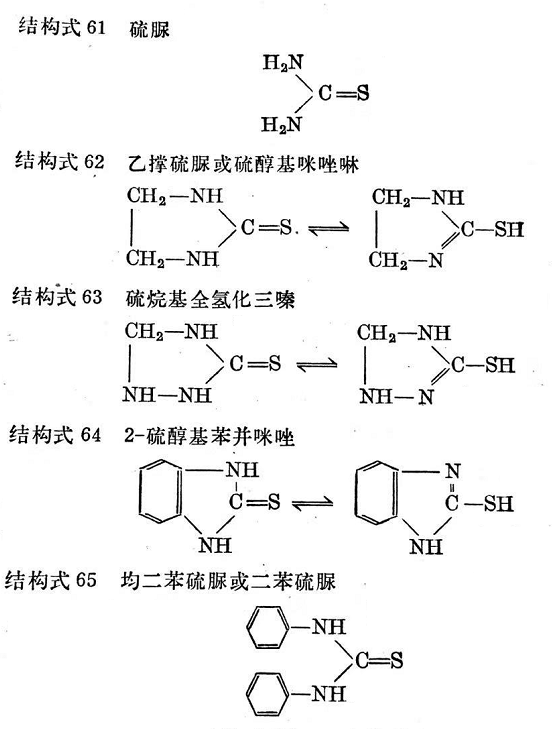 根據(jù)方程式267~270,硫脲基看來是在氯丁膠中起促進作用的一個官能團。目前所有重要的聚氯丁二烯促進劑中都含有這種官能團(見結(jié)構式61~65)。