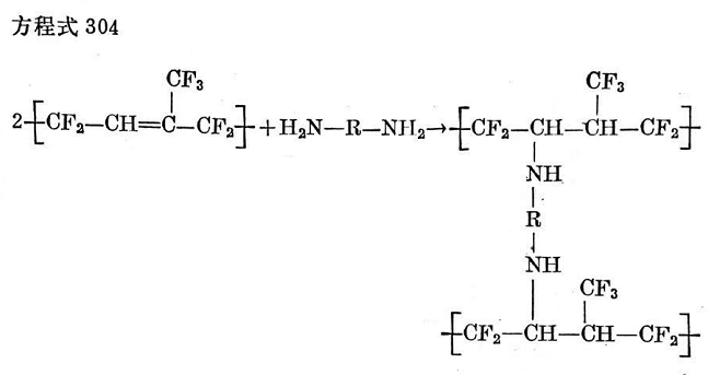 關于氟橡膠用胺交聯(lián)的機理,目前有各種不同見解”3。按照第一種理論,由于堿的催化作用,從聚合物鏈中放出氟化氫,而留下不飽和鍵(見方程式303):