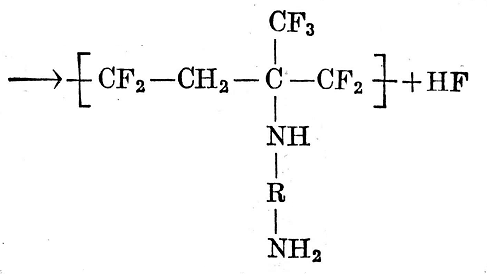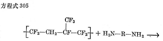 根據第二種理論,胺被聚合物鏈在連有CF3基的碳原子上所氟烷基化,并由此分裂出氟化氫(見方程式305)。胺的加成發(fā)生在受CF3基的影響而氟原子連接特別不穩(wěn)定的位置上。
