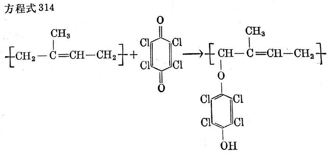 醌和橡膠在某種程度上能夠通過醌的加成進行反應(yīng)。已知硫化特快的四氯代苯醌05本身能加到分裂出氫后的橡膠鏈a-次甲基的碳原子上(見方程式314)。但是,最初這一加成過程并不引起任何交聯(lián)。