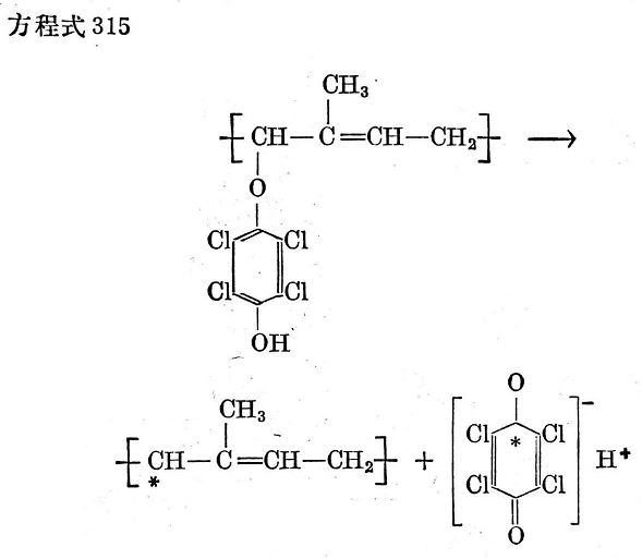 實際上,交聯(lián)在脫氫之后才發(fā)生。脫氫引起醌分裂為半醌,產(chǎn)生橡膠鏈游離基(見方程式315),從而按照方程式313交聯(lián)。這一反應(yīng)是以方程式312形成半醌的機理進行。