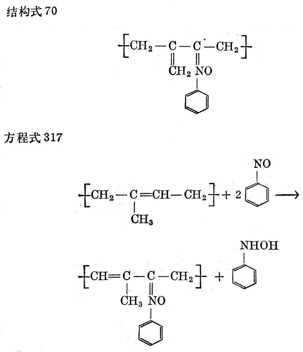 早在1915年,L.阿利桑德利(L. Alessandri)928就指出亞硝基化合物能與橡膠進行反應。G.布魯內(nèi)和E.蓋格爾(E. Geiger)二人及R.普梅雷爾(R. Pummerer)和W.居德爾(w. Gundel)s等人都說這種反應的結(jié)果得到橡膠硝酸靈或異構(gòu)化橡膠硝酸靈(見方程式317)。普梅雷爾斷定異構(gòu)化橡膠硝酸靈(見結(jié)構(gòu)式70)是最后的產(chǎn)物,這一點是大有爭議的。