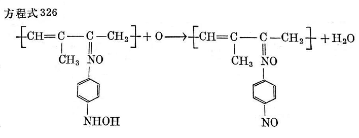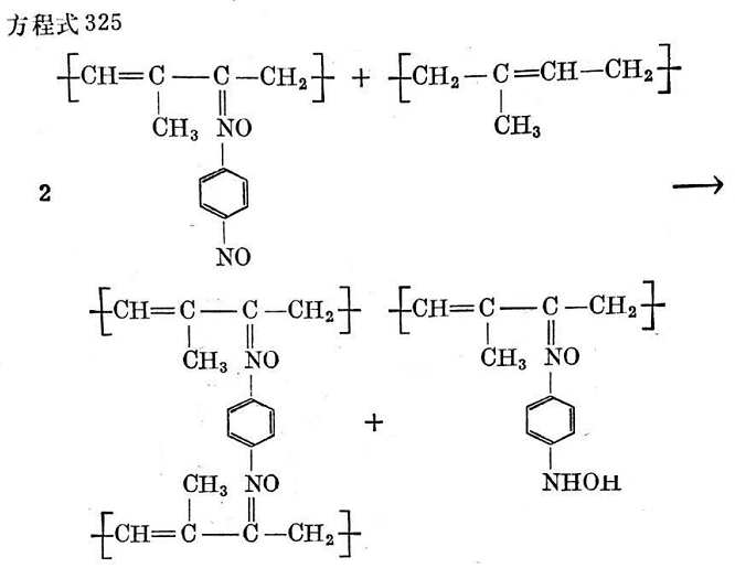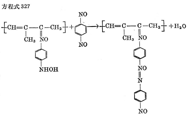 但是,橡膠硝酸靈的羥胺也能與對二亞硝基苯反應,生成對二亞硝基氧化偶氮苯橡膠硝酸靈(見方程式327),這也是個適于交聯(lián)的結(jié)構(gòu)。