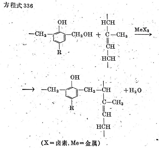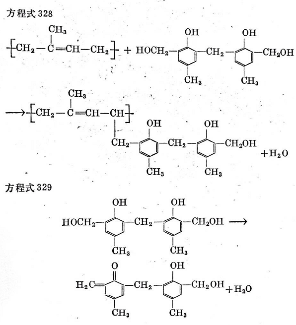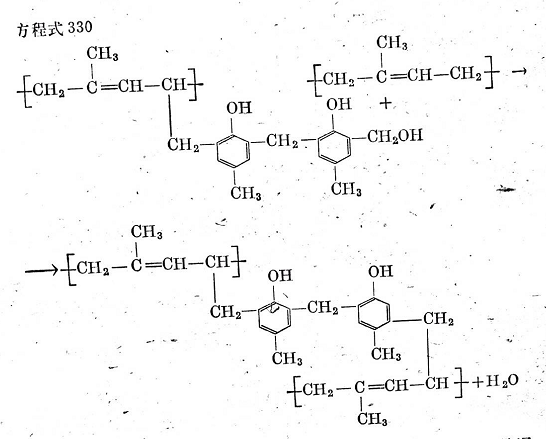 早在1942年,懷爾茨舒特( Wildschut)935報道某些酚醛樹脂可以硫化天然膠和合成膠(例如丁苯膠和丁腈膠)而無需加入其它物質(zhì)??墒?在155°C下,每100份生膠使用40份樹脂(均以重量計),其硫化時間為2小時。加入氧化鎂或炭黑,有可能將樹脂減少到30份,并將硫化時間縮短到1小時。硫化膠的性能可相當于用硫黃和促進劑正常生產(chǎn)的硫化膠(147°C×20分鐘)。在1947年范德米爾( Van der Meer)發(fā)表的論文中,考查了多種苯酚甲醛縮合物包括鹵代甲基苯酚縮合物的硫化作用。他認為,如果假定用酚醛縮合物交聯(lián)是同時分裂出水的樹脂縮合作用的繼續(xù),這種交聯(lián)可以用以下方程式表示(見方程式328~330)。