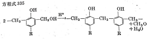方程式328的反應(yīng)與產(chǎn)生交聯(lián)的方程式330相似,是通過苯酚的鄰醌型結(jié)構(gòu)中間體及分裂出水的過程(見方程式329)進行的。