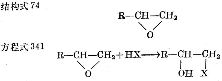 提起環(huán)氧樹脂,就會(huì)想起它有三節(jié)環(huán)特性(見結(jié)構(gòu)式74),因?yàn)榄h(huán)氧樹脂價(jià)角小,因而應(yīng)力相當(dāng)大,所以穩(wěn)定性很低。這些化合物極易與許多含不穩(wěn)定氫原子的物質(zhì)反應(yīng)(見方程式341)。