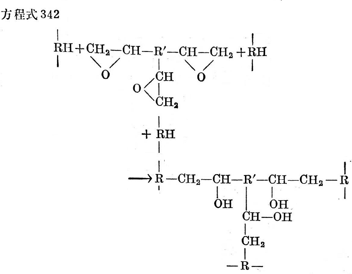 在同一分子中具有二個(gè)或多個(gè)環(huán)氧基的化合物一一通常稱為環(huán)氧樹脂一一能夠與二個(gè)或多個(gè)相同的或不同類型的分子反應(yīng)。如果反應(yīng)物限于具有不穩(wěn)定氫原子的橡膠分子,則發(fā)生分子鏈增長(zhǎng)或交聯(lián)反應(yīng)(見方程式342)。