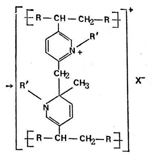 上面已經(jīng)說過,通過聚合作為側(cè)基引入的乙烯基吡啶基與含氯物質(zhì)反應(yīng),形成有極鍵。其基本反應(yīng)據(jù)信如下(見方程式344-347)
