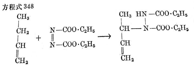 據(jù)奧爾德(K. Alder)、帕舍爾(F. Pascher)和施米茨(ASchmitz)報道,偶氮二羧酸二乙酯與丁烯、異丁烯、二異丁烯和戊烯之類的不飽和烴反應(yīng),在a-次甲基上發(fā)生“烯丙位置的取代加成反應(yīng)”,由此氫發(fā)生轉(zhuǎn)移并生成N-鏈烯肼?lián)味人狨?見方程式348):