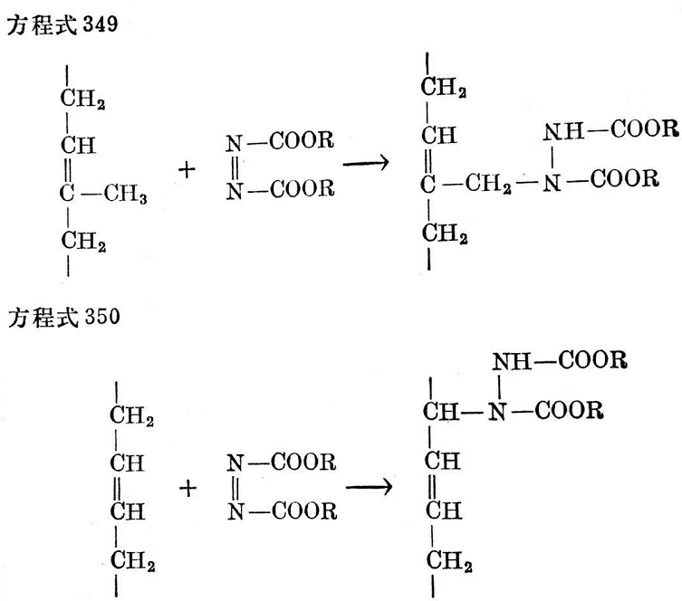 但是,偶氮二羧酸酯的反應(yīng)性并不限于對上述普通的低分子不飽和烴的作用,根據(jù)奧爾德的意見,它也能與高分子不飽和烴,如天然膠和合成膠反應(yīng)(見方程式349和350)。