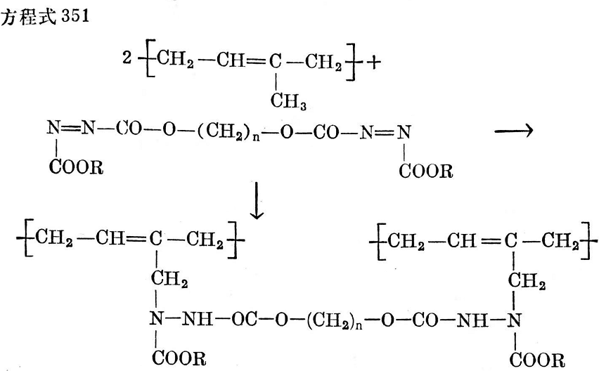 當(dāng)用含有兩個或多個偶氮基的化合物代替單偶氮酯化合物時,情況就不同了。根據(jù)上述機(jī)理,用雙官能化合物如雙偶氮酯能將兩個烴鏈相互連結(jié)起來。首先由E.馬勒(EMuller)和O.拜耳(O. Bayer),后來由P.J.弗洛里(P.J.Flory)、N.拉布約翰(N. Rabjohn)。將這一反應(yīng)用于交聯(lián)(見方程式351):