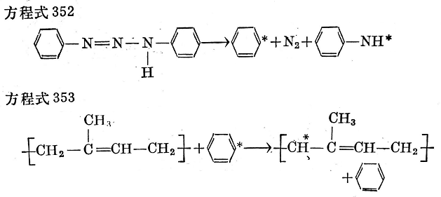 用重氮氨基苯交聯(lián)時,由于硫化膠中出現(xiàn)二苯胺,所以必然認(rèn)為其中游離基按方程式356的形式產(chǎn)生去活化作用。
