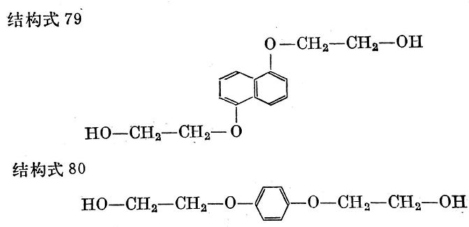 與制造類(lèi)似的柔軟材料一樣,要生產(chǎn)高質(zhì)量的硬性氨基甲酸酯橡膠,最重要的是引入“結(jié)晶中心”。用1,5-萘二異氰酸酯能得到最好的硬性材料。如果基本組份是“非硬性”二異氰酸酯,如4,4-二苯甲烷二異氰酸酯,則用“硬性二元醇”更為可取,因?yàn)樗苤频酶粡椥缘牟牧?,其代表性產(chǎn)品如結(jié)構(gòu)式79和80所示: