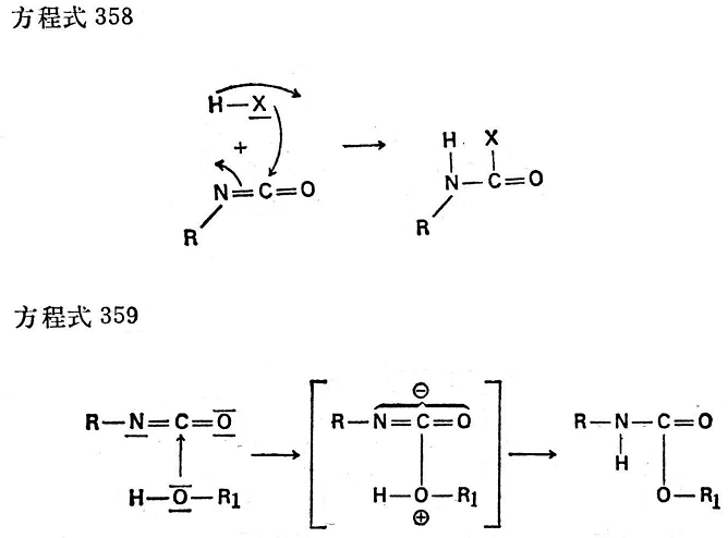 當含易活動氫的化合物加到異氰酸酯上時,因有自由電子對可用,附加物HX可作為親電子異氰酸酯的親核反應合作者。紅外光譜測定表明,由于譜圖中沒有明顯的羧基帶,所以異氰酸酯必然作為一個整體看待。異氰酸酯的穩(wěn)變異構現(xiàn)象可用以下結構式描述(見方程式357)。