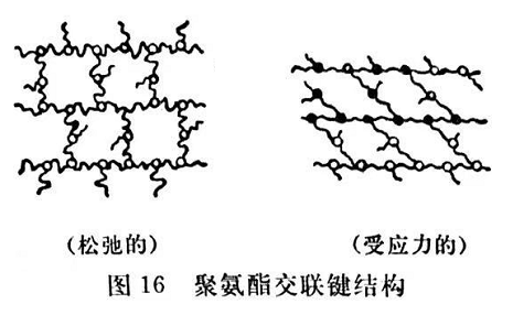 因為鏈是由同樣的“增長之二異氰酸酯”形成和交聯(lián)的,所以產生的彈性體就有一個網目大小非常規(guī)整的網絡結構(用圖16表示)。