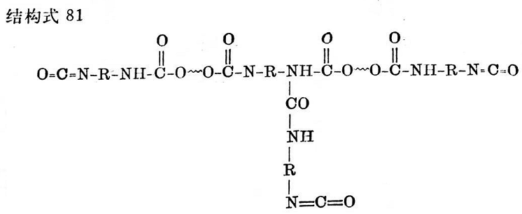 不能背定說在其他類型的材料制造中就不發(fā)生少量的脲基甲酸酯交聯(lián)。因為在制造長鏈二異氰酸酯時,也不是不可能形成少量支化的三異氰酸酯(見結構式81)。