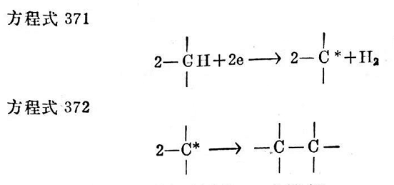 聚合物通過(guò)高能輻射產(chǎn)生游離基,游離基再通過(guò)相互飽和而產(chǎn)生C一C交聯(lián)鍵。根據(jù)2.3.2.2.2節(jié)的說(shuō)法,硫化膠可望有良好的耐高溫性能。交聯(lián)過(guò)程的最簡(jiǎn)單的形式如方程式371和372所示: