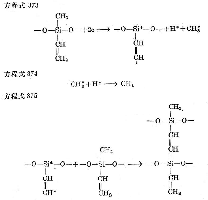 但事實(shí)上交聯(lián)機(jī)理有時(shí)是比較復(fù)雜的。例如,曾發(fā)現(xiàn)硅橡膠的甲基能作為游離甲烷裂解出來(lái)(見(jiàn)方程式373至375)。