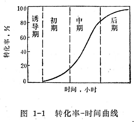 在聚合反應(yīng)整個過程中,聚合速度是不斷變化的,如一些單體(氯乙烯、苯乙烯、甲基丙烯酸甲酯等)在間歇式聚合時,隨著轉(zhuǎn)化率的逐漸增大,聚合速度也發(fā)生變化。轉(zhuǎn)化率隨聚合反應(yīng)時間變化的典型的曲線常呈S型,如圖1-1所示。聚合反應(yīng)可分為四個階段。