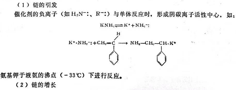 這類聚合反應(yīng)所采用的催化劑差不多都是堿性物質(zhì),主要有堿金屬K、Na、Li及其氨化物(如KNH2、NaNH2等),Ca(OH)2、KOH以及金屬有機化合物(如丁基鋰CHLi、格氏試劑 CsH Br等)。陰離子聚合反應(yīng)也可分為三個階段,即