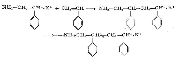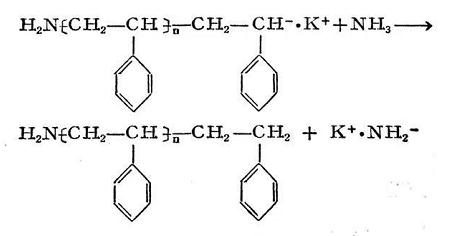 根據(jù)實驗結(jié)果,在聚合物分子中沒有不飽和鍵,排除了H?向單體轉(zhuǎn)移的可能性,又因氨基鉀在聚合過程中不消耗,也排除了増長著的陰離子與K的作用,所以鏈終止是向溶劑轉(zhuǎn)移,同時氨基離子再生。