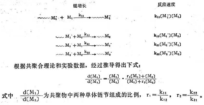 游離基共聚合反應(yīng)比均聚合反應(yīng)速度慢,共聚物的分子量也比均聚反應(yīng)所得高聚物的分子量要低。對(duì)共聚反應(yīng)的研究還要考慮如何控制共聚物的組成問(wèn)題。