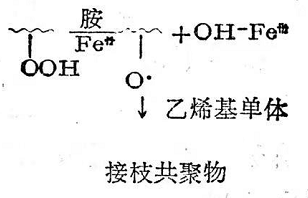 例如天然橡膠濃縮膠乳與甲基丙烯酸甲酯混合后,再加入10%的四乙撐五胺和1%的硫酸亞鐵等氧化還原體系,使進(jìn)行接枝共聚,則在主鏈上生成的過氧化氫基團(tuán)轉(zhuǎn)化為游離基然后引發(fā)單體進(jìn)行接枝。