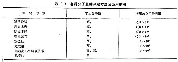 測定高聚物的方法有許多種,可分為化學法(如端基分析)、熱力學法(如沸點上升、冰點下降和滲透壓法)、動力學法(如超速離心與沉降及擴散法,粘度法。以及光散射法等其它方法。)測定各種分子量的不同方法及所得平均分子量的統(tǒng)計意義見表2-4。